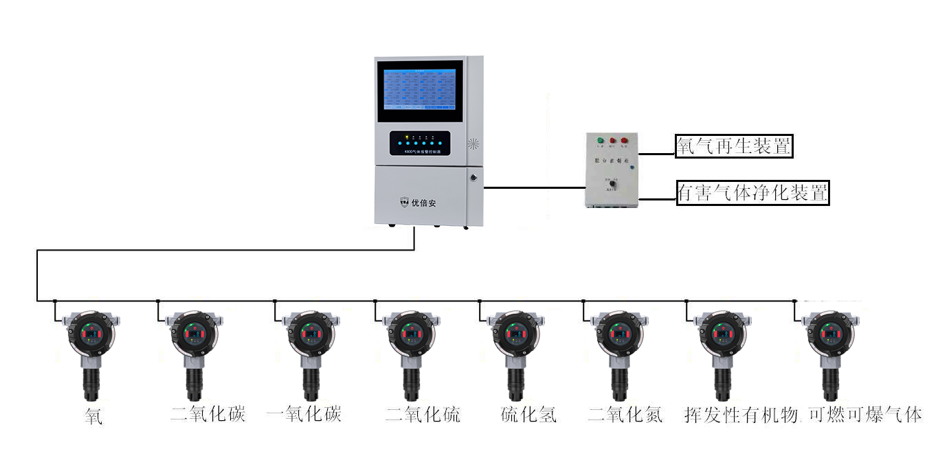 環(huán)境設備監(jiān)控系統(tǒng):在石油石化各個易產生有毒有害氣體的場所,放置氣體檢測報警器,時刻監(jiān)測大氣中有毒有害氣體的含量,通過控制主機將各種信號采集、存儲、自控、上傳,實現對石油石化領域的環(huán)境監(jiān)控。