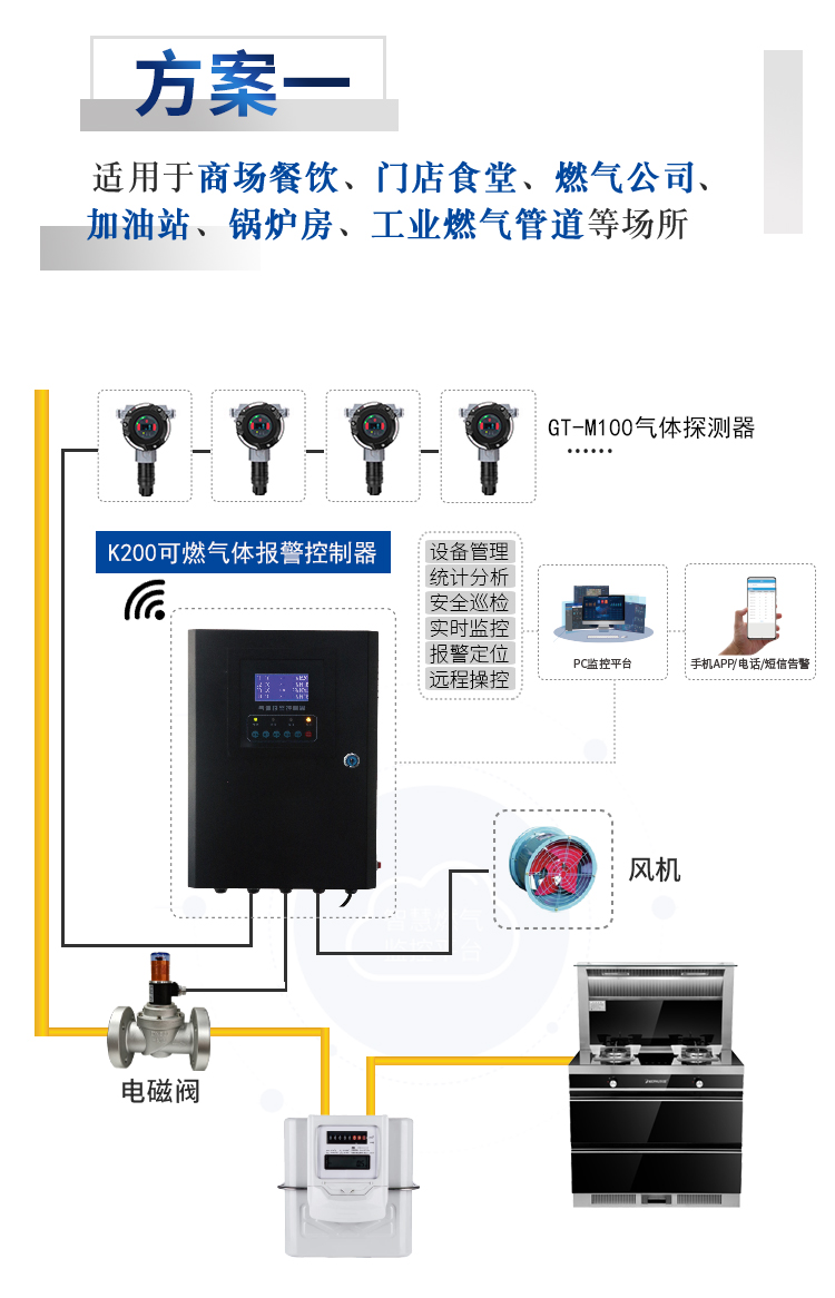 可燃?xì)怏w探測(cè)器可實(shí)時(shí)檢測(cè)可燃?xì)怏w泄漏濃度,當(dāng)待測(cè)氣體泄漏濃度達(dá)到或者超過(guò)預(yù)設(shè)值,報(bào)警器會(huì)立即發(fā)出聲光報(bào)警信號(hào),還可聯(lián)動(dòng)電磁閥、風(fēng)機(jī)等設(shè)備動(dòng)作,保障用氣安全。