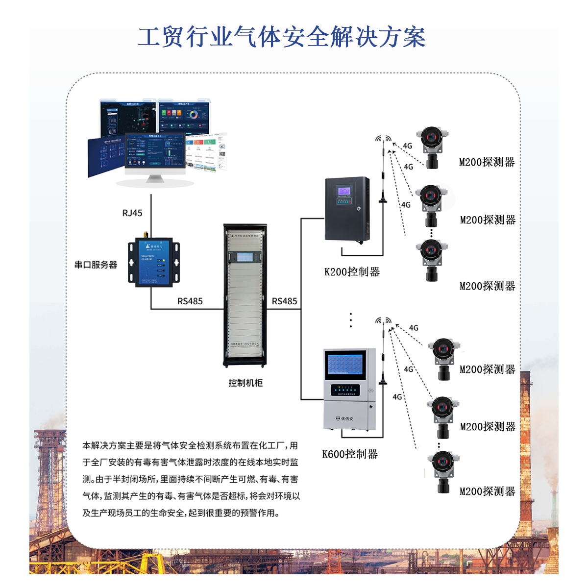 該方案可實(shí)時(shí)監(jiān)測(cè)工貿(mào)企業(yè)有毒有害氣體泄漏濃度,以保障生產(chǎn)安全,預(yù)防職業(yè)病。